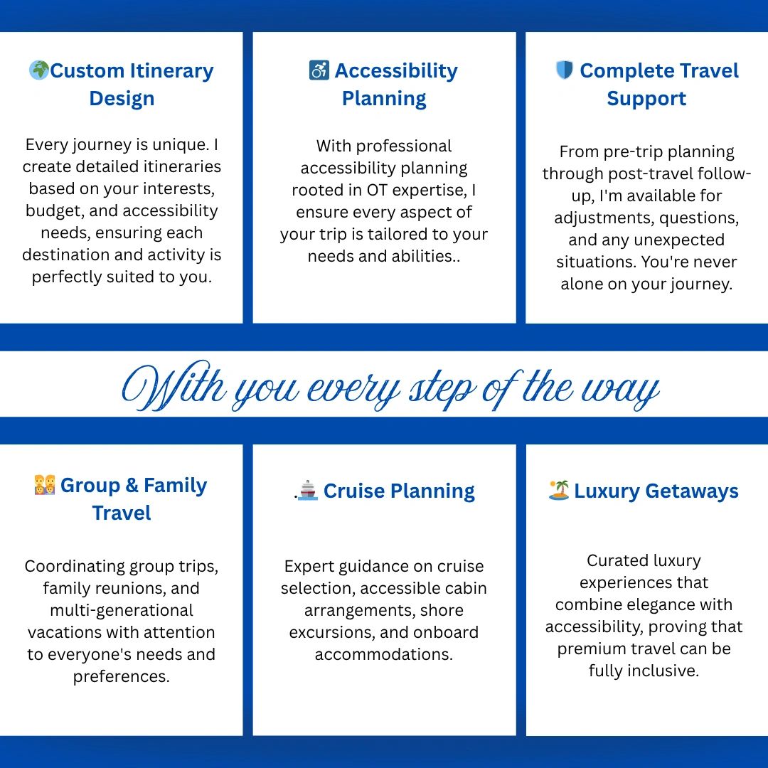 We specialize in organizing seamless group travel experiences tailored to your unique needs. Whether you're planning a family reunion, destination wedding, corporate retreat, school trip, or a special interest tour, I handle every detail—from accessible lodging and transportation to inclusive activities—so your group can focus on making memories, not managing logistics.